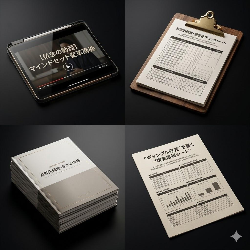 今回、LINEにご登録いただいた方限定で、あなたの院を劇的に変革する以下の4つの極秘チェックリスト、レポート&動画を無料でお渡しします